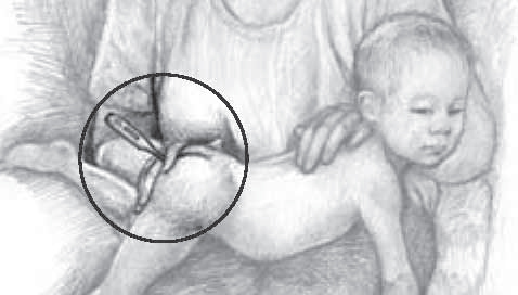 • Place your child belly down across your lap or on a firm surface. Another way is on the back with the legs pulled up to the chest. Turn the thermometer on and slide it 1/2 inch (for babies less than 6 months old) to 1 inch into the anus. Be gentle. There should not be any resistance. If there is, stop. Hold your child still. Leave the thermometer in place until it beeps. Then remove and check the digital reading.