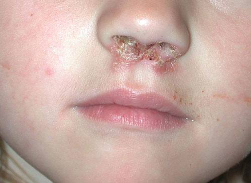 Impetigo can develop anywhere on the body. It is especially common on the face, including around the nose, mouth and ears. It is also frequently seen on the arms and legs. Less commonly, impetigo can develop in the