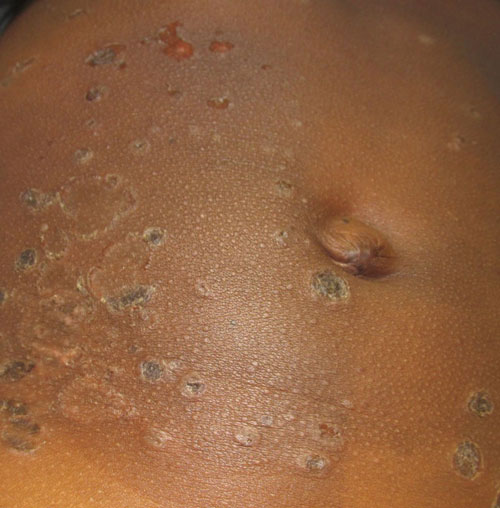 Impetigo images from top to bottom: axillary impetigo (on armpit); perinasal impetigo (around nose); perioral impetigo (around mouth) and impetigo on torso. Images courtesy Sarah Stein, MD, FAAP. About Dr. Polcari