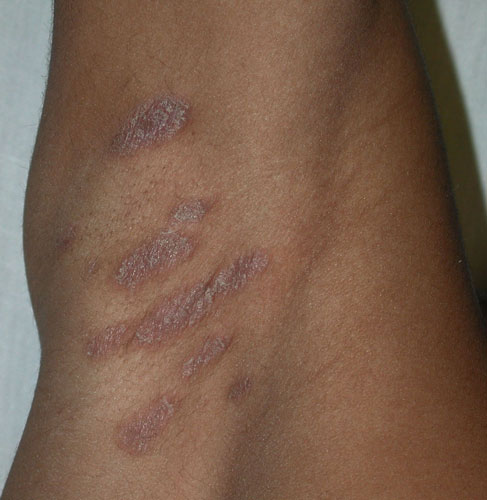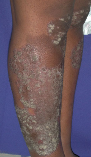 Plaque psoriasis is the most common type of psoriasis. There are thick or thin reddish or purplish patches with stuck-on white flakes. These patches are most common on the elbows and knees and sometimes the scalp, but can be anywhere on the body.