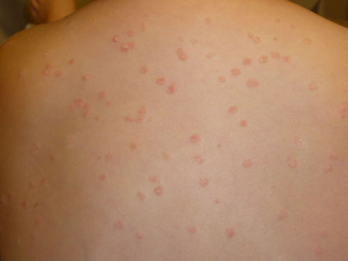 Guttate psoriasis looks like small, raindrop-shaped spots with a little bit of white flaking on top. This pattern of psoriasis is sometimes seen after strep throat or other minor infections. | |