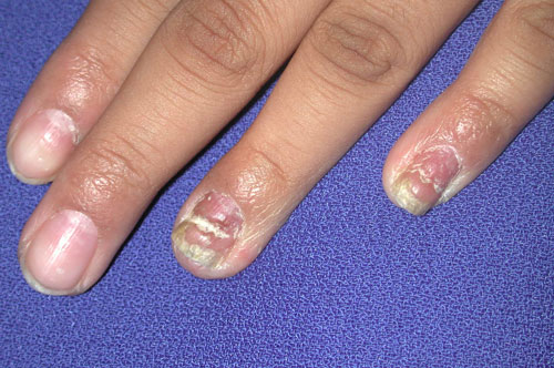 Nail psoriasis affects the fingernails and toenails causing the nails to have small pits or grooves or to lift up at the edge or to become yellow brown in color. | |