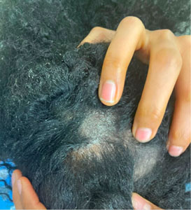 The child's scalp may be red. Often, there are crusty bumps, sores, broken hairs and missing spots of hair. In addition, the infection may cause lymph nodes in the neck may be swollen or enlarged.