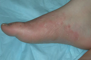 Tinea pedis ("athlete's foot"): The skin between the toes will be moist and peeling. Sometimes there are red or purple-brown scaly rings on the tops of the toes and feet. This type of tinea rash is most common in teenagers.
