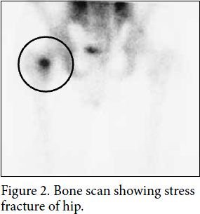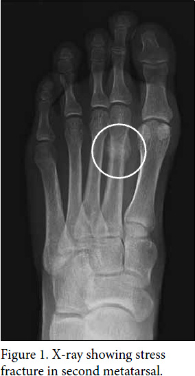 To confirm the presence of a stress fracture, your doctor may need to order an x-ray (see Figure 1). If the x-ray does not show a stress fracture, a bone scan (see Figure 2) or magnetic resonance imaging (MRI) may be needed.