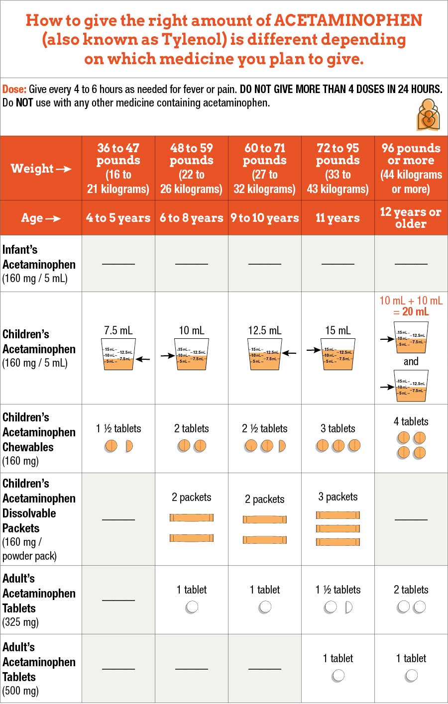 The tables* below can help you figure out the right amount to give. (Find a print-friendly version here.) Use your child’s weight to decide on the right amount to give. If you do not know your child’s weight, use your child’s age. Be sure to check with your child’s doctor to make sure you are giving the right amount.
