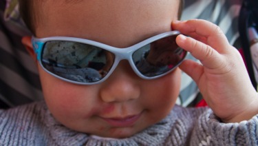 In infants and toddlers not wearing sunglasses: Beware of excessive blinking or unexplained crankiness. Remember, infants under six months should be kept out of direct sunlight.