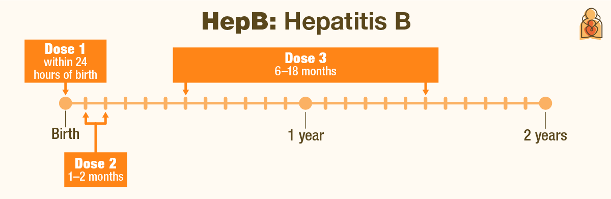 Hepatitis B is the first vaccine most babies receive. It is given within 24 hours of birth. Your baby will get a second dose of hepatitis B vaccine when they are 1 month to 2 months old and the third dose when they are 6 months to 18 months old.