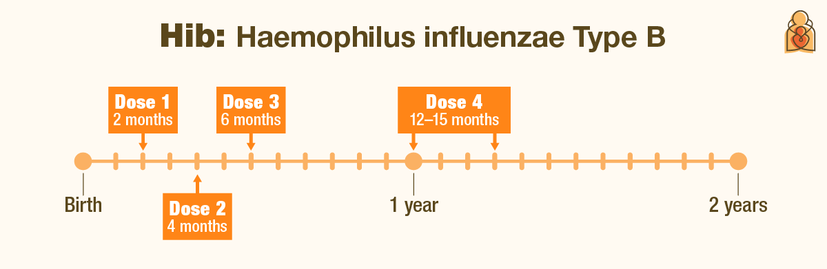 Haemophilus influenzae type B (Hib) vaccine (3 or 4 doses) prevents several types of illness, including ear infections, lung infection, swelling in the throat and swelling in the lining of the brain and spinal cord (meningitis). Infections can be life threatening. If babies have not been vaccinated and have symptoms of meningitis, they may need a spinal tap to test the spinal fluid for the bacteria.