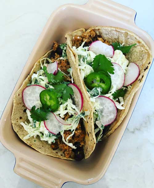Place tofu black bean crumbles on top of tortilla and top with cabbage slaw. Top with squeeze of lime and/or chopped avocado.