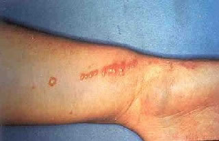 The redness and blistering from the rash is often arranged in streaks or lines, because the leaf brushes across the body in a line as a person walks past.