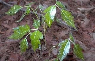 Poison oak can grow on a tree or a vine. The leaves look wavy and grow in groups of threes.