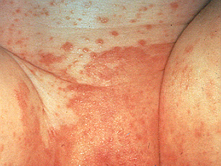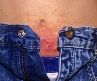 This shows a rash that was caused from the skin touching the snap on the jeans. This person is allergic to the nickel in the snap. The area is red and crusty.