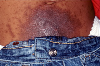 This shows a rash that was caused from the skin touching the snap on the jeans. This person is allergic to the nickel in the snap. The area is raised and crusty.
