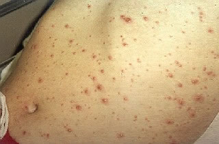 The Chickenpox rash can occur on all body surfaces. The rash is raised, red and itchy.