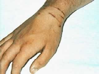 The photo shows 3-4 parallel scratches on the wrist caused by a cat.