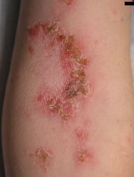 This shows impetigo on the elbow. Impetigo is a skin infection caused by bacteria. The infection causes a red sore which leaks fluid. This area will then dry and become crusty as it heals.