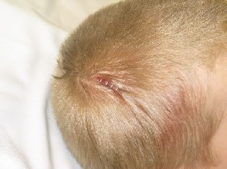 This photo shows a scalp laceration after it has been closed with 4 metal medical staples.